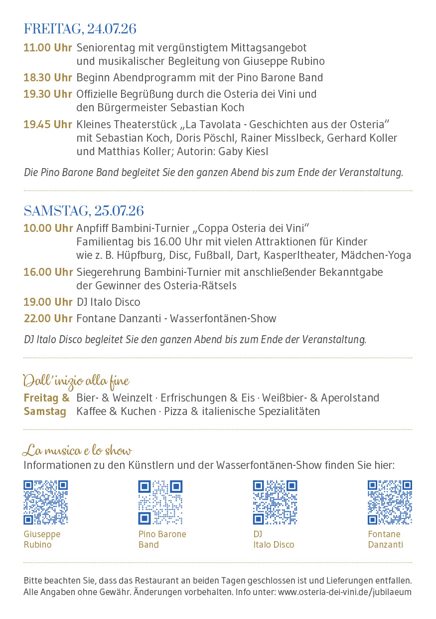 Heute feiern wir 30 Jahre Gastfreundschaft. Mit diesem Fest blicken wir zurück auf drei Jahrzehnte voller Geschichten, Begegnungen und guter Gespräche. Auf unzählige Teller Pasta, Pizzakartons und Gläser Wein. Auf Millionen gelaufene Kilometer, italienische Lieder und unvergessliche Momente.