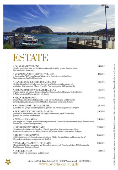 Die Osteria dei Vini hat ihren Lieferservice ausgeweitet. Bestellen Sie bequem per SMS oder über WhatsApp und genießen Sie schon kurze Zeit später unsere abwechslungsreichen Speisen.